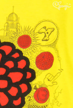 チャリTの後ろ側、草間さんは赤い水玉の集合体でハートを象っています。