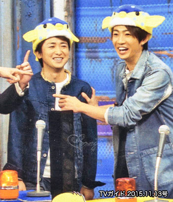 アタフタしている相葉くんを優しく見ている智くん、ハコフグ帽の左右のヒレが下がっていて、嬉しがっているワンコの耳みたい。むっちゃ可愛い。マイナスイオン出してるねえ。