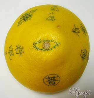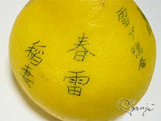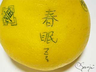 黄色いものに『春眠 Zzz 』と書かれていますが、この黄色くて丸いもの、実は文旦(ぶんたん)という柑橘類。